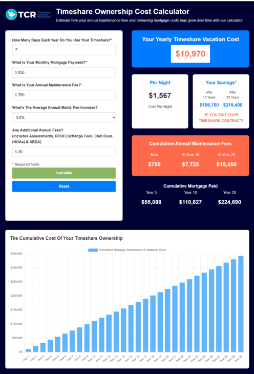 It depends on the specifics of your timeshare contract (or contracts, as many people have more than one timeshare contract). Our average fee range is always a fraction of what you will spend for your timeshare. In making your decision, you should calculate the total savings from exiting, including not having to pay maintenance fees, special assessment fees, facility fees, or high interest rate monthly payments if you are paying monthly on a note.