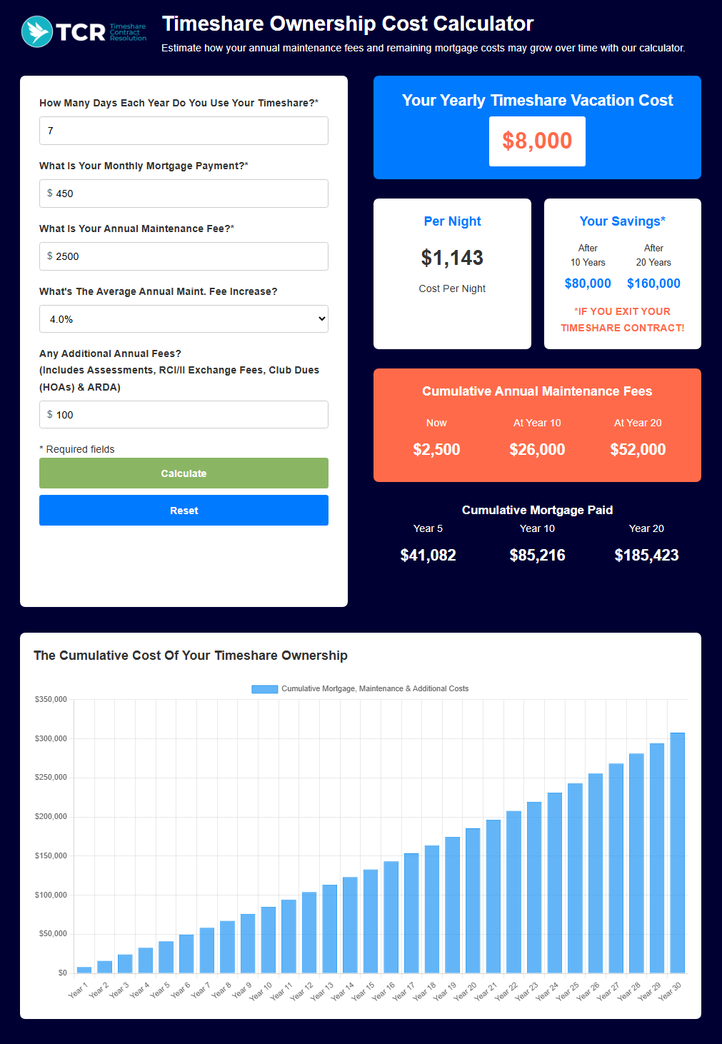 It depends on the specifics of your timeshare contract (or contracts, as many people have more than one timeshare contract). Our average fee range is always a fraction of what you will spend for your timeshare. In making your decision, you should calculate the total savings from exiting, including not having to pay maintenance fees, special assessment fees, facility fees, or high interest rate monthly payments if you are paying monthly on a note.